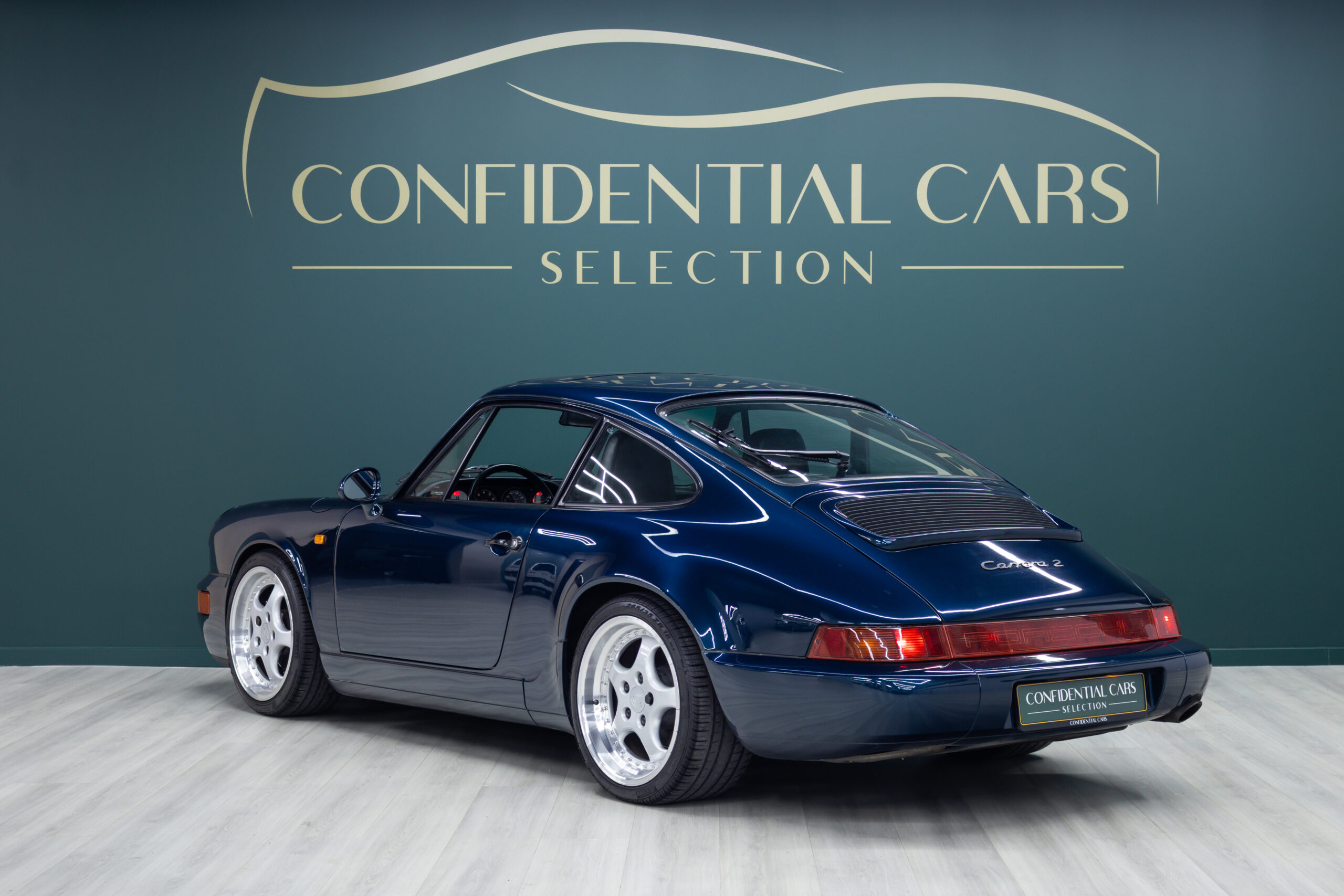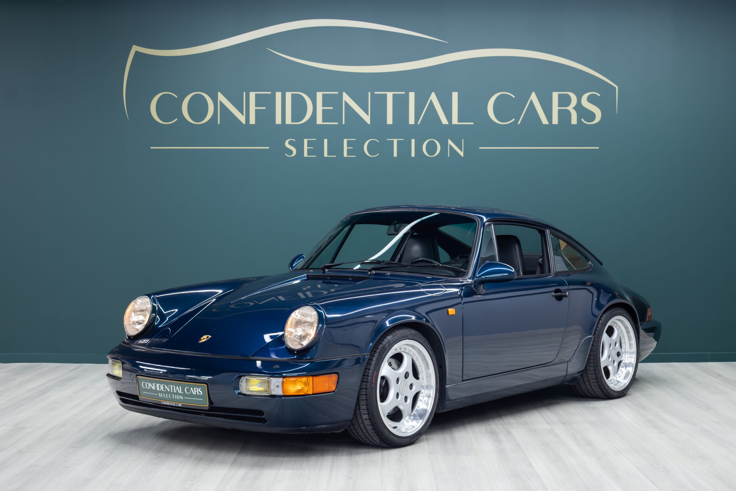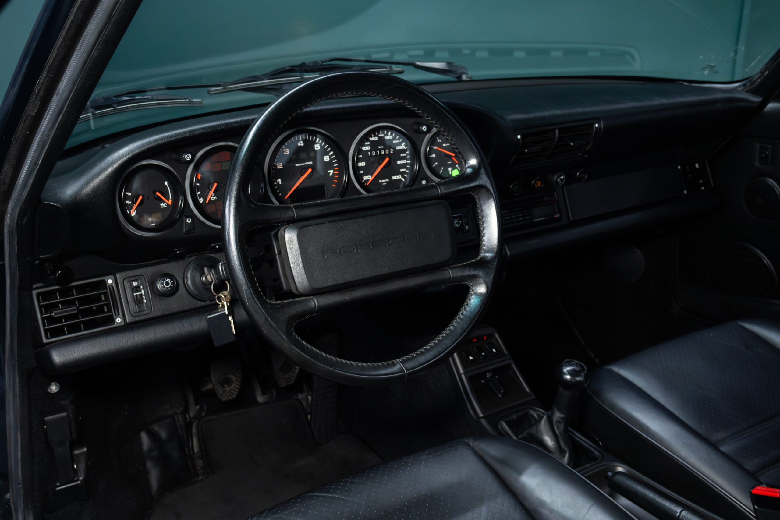 Présentée dans sa teinte rare Amazon Green, associée à un intérieur tout cuir noir, cette Porsche 964 C2 bénéficie d’une configuration élégante et recherchée.