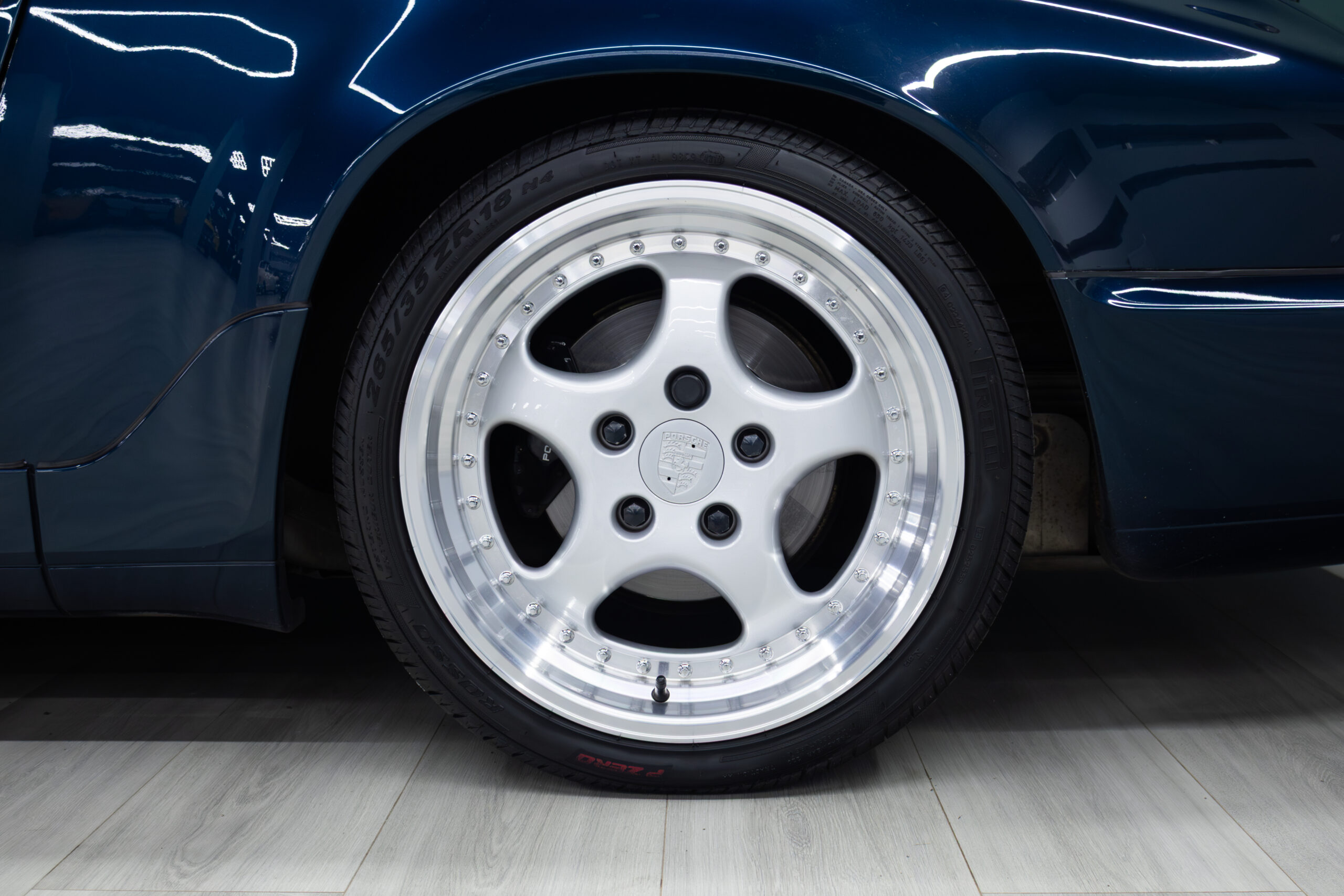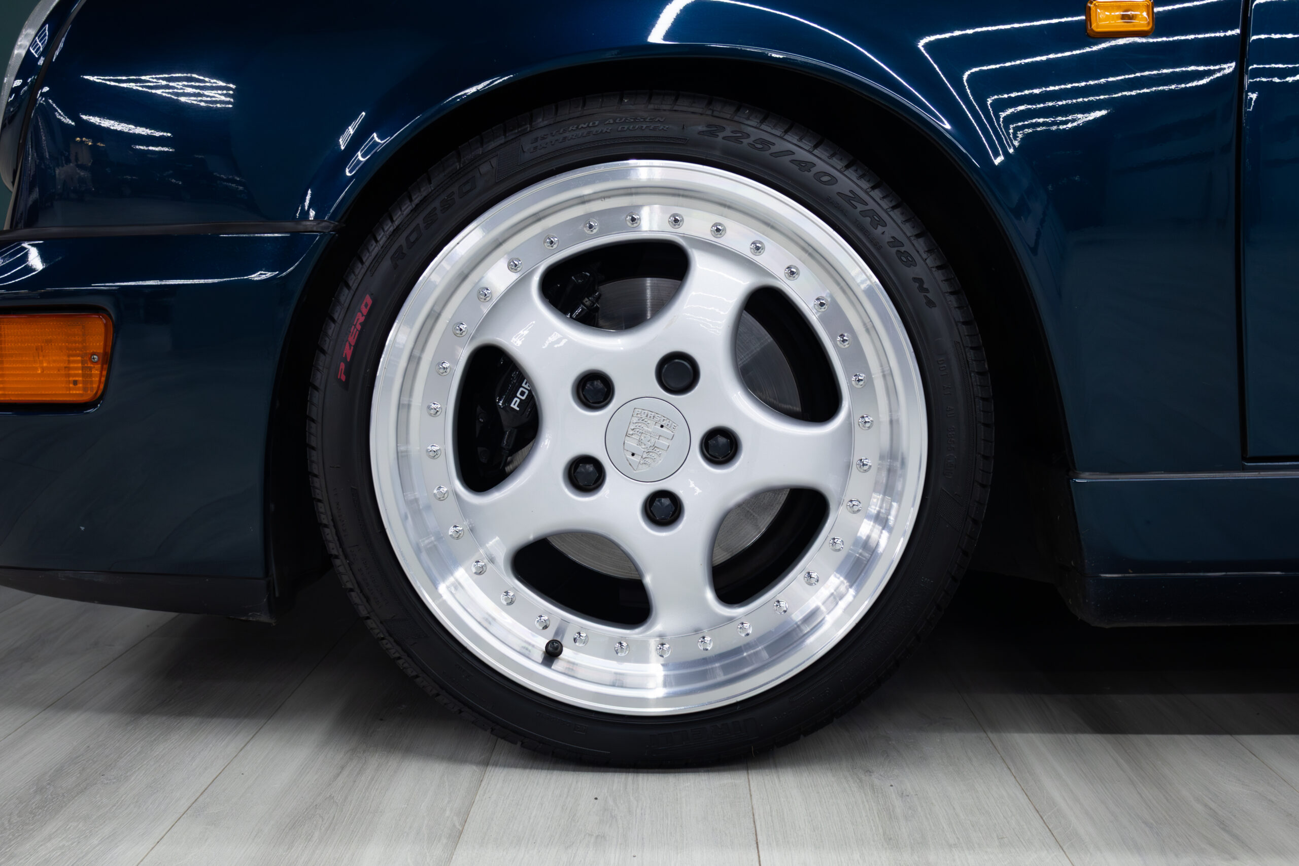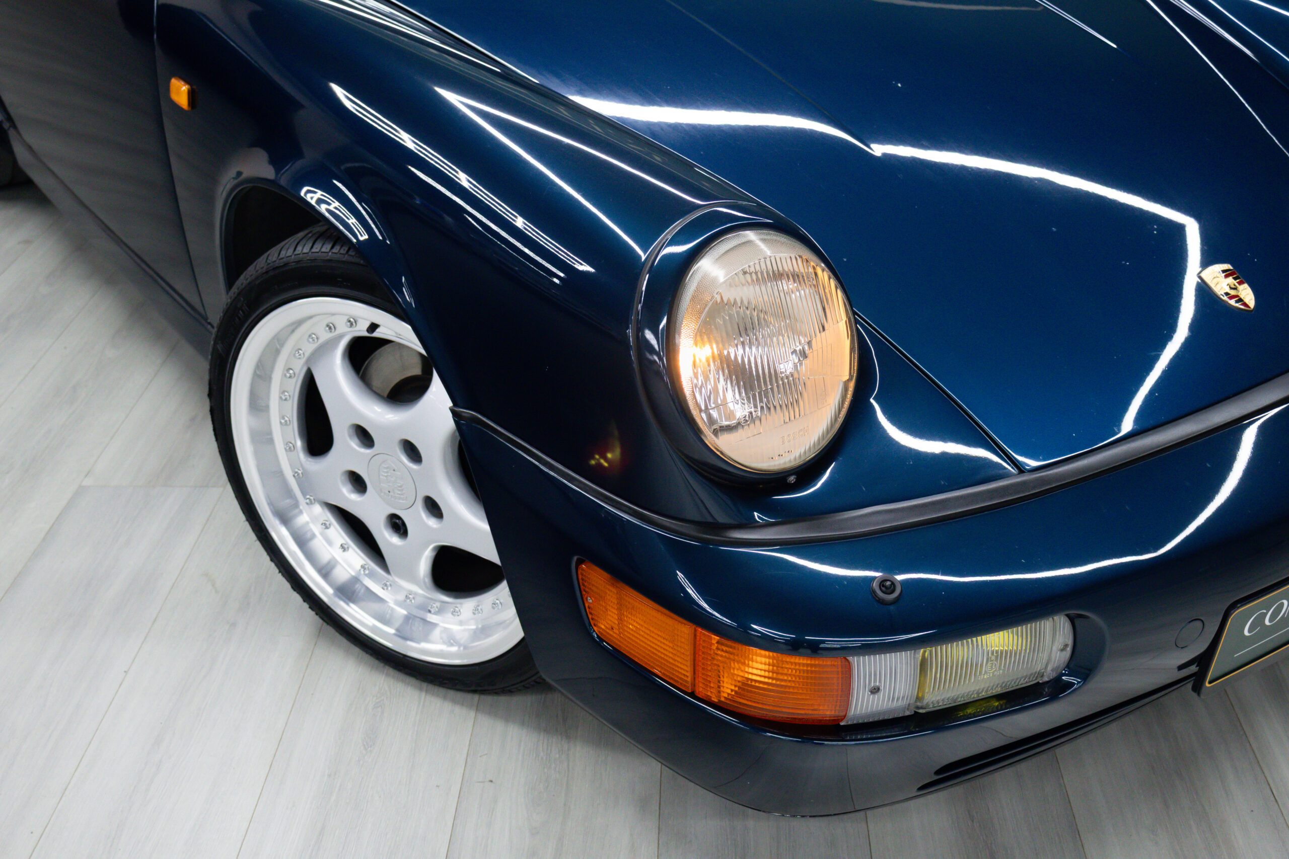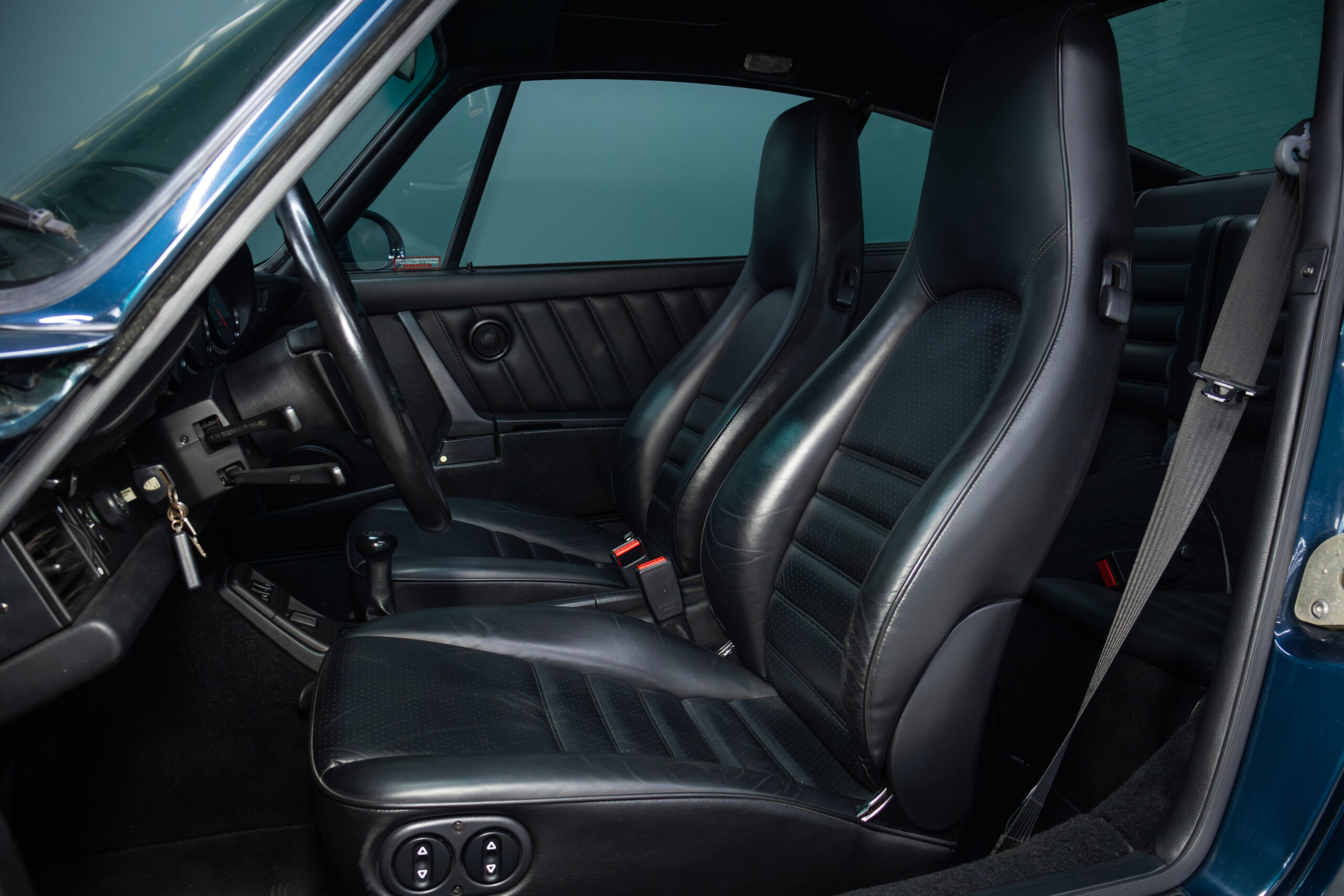 Présentée dans sa teinte rare Amazon Green, associée à un intérieur tout cuir noir, cette Porsche 964 C2 bénéficie d’une configuration élégante et recherchée.